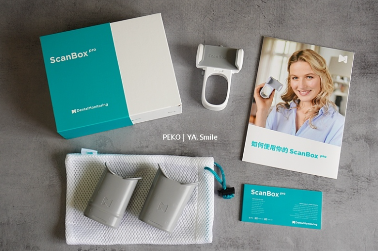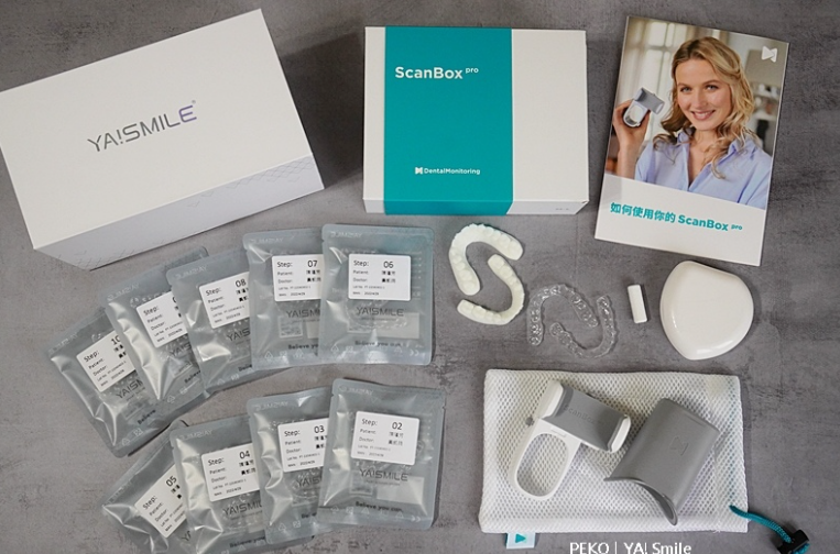 ya!smile 的輕矯正組合包含精裝盒、牙套、牙模、貝殼盒以及ScanBox。