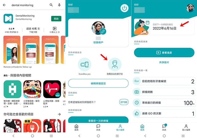 組裝後照著App指示拍攝口內影像,分別拍攝沒戴牙套、戴上牙套的影像後上傳完成評估;Dental Monitoring APP 掃描齒列的動作每兩個星期一次,有達到標準就會通知更換下一副輕矯正隱形牙套。