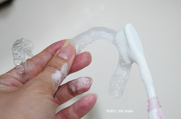 「ya!smile」不是用鋼線固定在牙齒上的傳統牙套,可以隨時隨地自行拆卸,如果你不想花錢買牙套清潔錠,就用牙膏+牙刷,先刷自己的牙起泡,再刷隱形牙套,清潔起來也十分方便。
