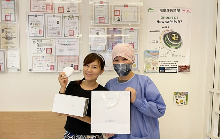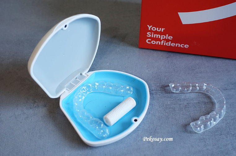 配戴「ya!smile」的輕矯正隱形牙套,戴上去後還要使用”咬咬”(右圖),”咬咬”可使牙齒與牙套更加緊密貼合。